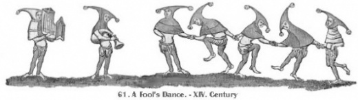 The fool's dance, or a dance performed by persons equipped in the dresses appropriated to the fools, is very ancient, and originally, I apprehend, formed a part of the pageant belonging to the festival of fools. This festival was a religious mummery, usually held at Christmas time; and consisted of various ceremonials and mockeries. A vestige of the fool's dance, preserved in a MS. in the Bodleian Library, written and illuminated in the reign of king Edward III. and completed in 1344, is copied below.